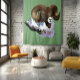 A portrait of a Ram / Bighorn Sheep with mountains and purple flowers in a backdrop of green
