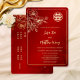 This traditional Chinese wedding invitation features a real gold foil double happiness symbol and real gold foil line art flowers on a dark red background. Bride and groom names in an elegant handwritten script. With a traditional Chinese text on the backside. Chinese wedding invitation or tea ceremony invitation.