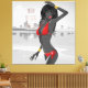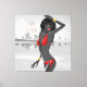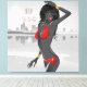 Beautiful girl in her bright red bikini and glammed out with her gold jewelry - she stands in front of a city skyline maybe the Riviera? - - This would be a great advertisement in a boutique - contemporary in style and fun to look at - Perfect for office , home or lobby. Can easily be sized down -