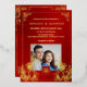 This elegant Chinese wedding invitation features a photo, a gold foil Chinese frame and round gold double happiness symbol and gold foil flowers on a floral ruby red shimmering background. With a traditional Chinese text at the backside. Chinese wedding invitation or tea ceremony invitation.