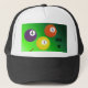 A great design featuring three colorful pool balls with numbers on. The tip of pool cue in the corner on a shaded green background. Says 'game on' the saying can be changed as desired.