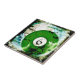 A grungy design of the cue ball behind a Billiards ball number 6.