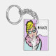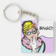 B-I-N-G-O! BINGO! This comic book inspired BINGO keychain is sure to bring a smile to the face of any Bingo lover. The design features a delightfully quirky woman with blonde hair piled on her head wearing a pink bow, cat-eye glasses, a pink and white zebra print collar and blue dress. One white gloved hand is resting on her pink lips as if she is suppressing a giggle. The speech bubble near her says, "BINGO!" The woman and speech bubble are both on a lavender and white background.
