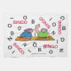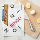 2 people playing bingo with bingo letters all over the kitchen towel.