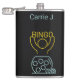 Personalized flask for bingo lovers, with neon yellow and blue Bingo Night line art graphics on black background.