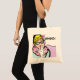 B-I-N-G-O! BINGO! This comic book inspired BINGO tote bag is sure to bring a smile to the face of any Bingo lover. The design features a delightfully quirky woman with blonde hair piled on her head wearing a pink bow, cat-eye glasses, a pink and white zebra print collar and blue dress. One white gloved hand is resting on her pink lips as if she is suppressing a giggle. The speech bubble near her says, "BINGO!" The woman and speech bubble are both on a lavender and white background.
