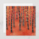 A modern landscape painting of a birch or aspen tree forest in the autumn in rich tones of red, orange and yellow.
