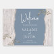 Birch Wood Dusty Blue Wedding Welcome Sign. Script font highlights with easy to read serif name font. Easy to adjust for your own wedding needs. Welcome sign for ceremonies, dinner parties, or other wedding events. Need to change all the text for another event? This easy to use template can be adjusted for any of your party needs. Just delete and add your own text.
