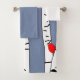 This towel set has a white washcloth, a blue-gray hand towel, and a bath towel with a winter design of birch trees with red birds sitting amongst them. It also has a slot for an added filter if desired.