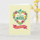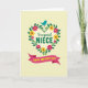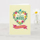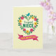 Designed with a leafy floral wreath at the center, this card feels like a warm hug shared between close family ❤️. Lush green leaves curve into a round frame filled with fuchsia and sunny yellow flowers, giving the scene a cheerful, affectionate glow. A small turquoise bird with an orange beak rests at the top of the wreath, as if watching over the message with a gentle, friendly gaze. Inside the wreath, the words “to a special” appear in a flowing, cursive-style line, while “NIECE” sits beneath it in larger green letters for emphasis. Near the bottom, a deep rose-pink ribbon banner stretches across the card, carrying “HAPPY MOTHER’S DAY” in bright yellow text. The background is a soft creamy tone dotted with faint, tiny circles that add texture without stealing attention 🌼. The wreath’s blossoms mingle with the greenery in a balanced ring, and the bird perches neatly above the topmost leaves.