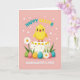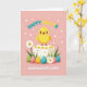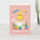 This greeting card features a plump yellow baby bird perched on a cream-colored cake, its wide eyes and open beak aimed forward as if calling out to someone it adores 🐰. The cake is topped with small yellow flower shapes and scattered red sprinkles, adding tiny accents that feel like shared laughter between friends. Below the cake, several decorated egg shapes in green, pink, gold, and teal sit nestled in fresh green grass, arranged close together like a cozy little group. Each egg has lines and dots in contrasting colors, giving them a carefully dressed-up look for the occasion. On the left side, a white daisy with a bright yellow center leans into the scene like a gentle companion 🌷. Near the top, a seasonal greeting appears in mixed bright colors, while a second line of text sits lower down in a darker shade, marking a first-time celebration. The background is pastel pink with faint white blossom outlines scattered across it.