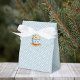 Simple pastel blue favor box with an illustration of a bird in a green egg. Perfect for baby shower favor gifts. Illustrated and designed by Patricia Alvarez.