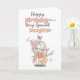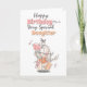 A beautiful illustration of a hand drawn whimsical bird cage that has two cute birds sitting on it chirping hearts. A pretty floral bouquet is tied to the side of the cage and the illustration is in shades of pastel peach orange, blue and yellow. The words, happy birthday to a very special daughter (which may be changed to granddaughter, niece, godchild etc) appears on a white background. The inside has a lovely tender message which should be customized to suit whatever family relation you have inserted on the front.