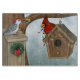 This pretty winter scene shows feathered neighbors sharing in the spirit of the season. The woodpecker is offering a sunflower seed to his cardinal friend, who is decorating his bird house.