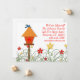 Whimsical moving announcement with birdhouse and colorful flowers.