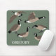 Create a personalized gift that's perfect for bird lovers. This custom mouse pad has realistic style illustrations of Canada geese in brown white and black set against a sage green background. Below the graphics is a spot to add a name in white lettering.