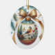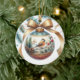 This white ceramic round ornament features a digital painted holiday design. The ornament includes a bow, pinecones, greenery, red berries, and a red-breasted robin. The back of the ornament has a Merry Christmas greeting and a timestamp. This ornament will beautifully complement a nature-inspired Christmas tree, especially one featuring songbirds. It's a thoughtful gift for any bird lover, with its pretty watercolor songbird design. AI artwork designed by susang6