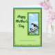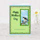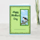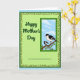 Designed with a calm spring look, this card features a soft green background bordered by a thin pale-blue edge, a deeper green band, and an inner trim of repeating earthy circles. On the left side, dark green lettering in flowing cursive spells out a Mother’s Day message, set with generous space around it so it feels airy. On the right, a tall rectangle frames a tender scene where a larger black-and-white bird with an orange beak stands close to a smaller companion, their bodies angled toward each other like a gentle hug ❤️. They balance on a sturdy brown branch that stretches across the frame, dotted with fresh green leaves that lean toward the pair as if sheltering them. Behind them, the sky is light blue with thin, wispy white clouds drifting past, adding a quiet, affectionate mood 🌼. Near the bottom of the design, a faint dashed line runs horizontally to guide where a short note could be written. The right-side picture panel sits neatly against the green field, with the birds’ orange beaks standing out against the cool blue sky.