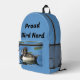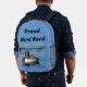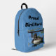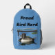 This backpack features a photo of a black and white duck with something to say. The main body of this backpack displays a bright blue color that can easily be customized. "Bird Nerd" can also be personalized if you desire.