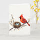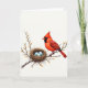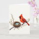 Designed with a serene nature scene, this card features a bright red songbird with a raised crest and a dark face marking, perched closely on a sturdy brown branch. The bird’s feathers shift from deep red to darker accents along the wings and tail, and its watchful eyes angle toward a nearby nest as if guarding something dear ❤️. Nestled on the same branch, a tightly woven nest of twigs and grasses holds three small speckled eggs in a soft, muted blue, adding a gentle note of closeness and care. Small spring buds in warm ochre tones dot the branch, suggesting a fresh season and a quiet moment shared. The background stays a luminous off-white, keeping the focus on the bird, nest, and eggs without extra scenery. Any text would sit neatly above the illustration in a simple dark gray, with a smaller line placed below in a lighter gray for balance 🌼. The composition centers the bird and nest on the branch, with the eggs’ pale blue standing out against the earthy browns and rich reds.