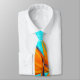 Big floral neck tie with orange bird of paradise flower over an aqua blue background design. Perfect for a Hawaiian wedding or summer event. The green and blue stem, along with the bright orange of the flower, is printed on the front, but is only partially visible. The remainder of the tie is bright aqua in color.