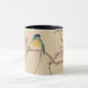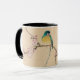 green and yellow bird perched on the limb of a Sakura tree. Pinkish background, with a black handle and interior. You can change the mug handle and interior colors if you wish, but I have found that this is the nicest option. It gives the mug great contrast and is pleasing to the eye.