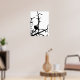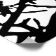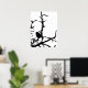 This contemporary fine art poster features a black and white modern abstract pattern of a silhouette Dark-eyed Junco (Junco hyemalis) perched on a bare branch high in a tree. This bird is actually a kind of small, gray and white sparrow.