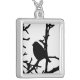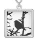 This contemporary fine art necklace features a black and white modern abstract pattern of a silhouette Dark-eyed Junco (Junco hyemalis) perched on a bare branch high in a tree. This bird is actually a kind of small, gray and white sparrow.