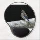 A mouse pad with a photo of a bird perched on a fence against a black background