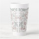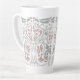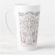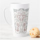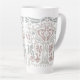 Tall latte mug with hand drawn abstract, symmetrical design. Branches of a leafless tree enclose bugs and birds in this design. Swirling gray, tan and gray-green colors wrap around a tall white mug.