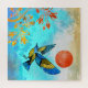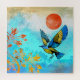 This gorgeous design depicts a blue and gold bird makng a landing on a golden tree with a beautiful sky of many blue colors and a bold orange sun.