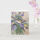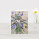 This note card has a black and yellow bird perched on a branch. There are purple and yellow pansies in the background. Blank inside.