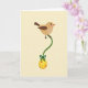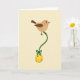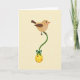 Designed with a sweet spring scene, this card features a small bird character in tan and brown, with a soft pink cheek blush and a bright orange beak, perched on a curling emerald-green vine. Its head tilts slightly as it gazes downward with a shiny black eye, as if keeping a caring watch over something special, like a quiet gesture of friendship. The vine sweeps in an S-shape and leads your eye to a hanging yellow egg dotted with red spots, tied in place with a green bow, adding a gentle touch of affection 🐇. The background is a pale buttercup yellow with a few tiny white cloud puffs scattered around, giving the scene airy breathing room 🌷. Any text can sit neatly near the top in a soft gray or muted green, with a smaller line near the bottom to balance the tall layout. The overall look uses simple shapes with light shading that gives the bird and egg a rounded, tender presence. The yellow egg hangs just below the midpoint, glossy and speckled, with the bow’s loops angled slightly to the left.