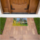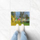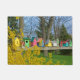 This doormat displays a row of colorful birdhouses basking in the spring sunshine. A yellow forsythia bush, trees, blue sky, and green grass frame the row of unique birdhouses. Show your love for feathered friends and their birdhouses.