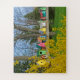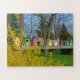This adorable jigsaw puzzle shows a row of colorful birdhouses basking in the spring sunshine. A yellow forsythia bush, trees, blue sky and green grass frame the row of unique birdhouses.