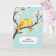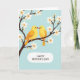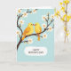 Designed with a soft, watercolor-like look, the scene centers on two small yellow birds perched close together on a shaded brown branch, angled toward each other as if sharing a quiet kiss ❤️. Deeper orange touches on their wings and tails add warmth, while their tiny black eyes and small red beaks nearly meet in a tender, friendly moment. Around them, the branch is dotted with white blossoms, each flower showing an orange-yellow center, plus several closed buds that hint at new blooms 🌼. The background stays a gentle pastel blue, leaving plenty of open space so the bright birds and flowers stand out without feeling busy. Near the bottom, a rounded, cloud-like white panel holds the words “HAPPY MOTHER’S DAY” in clear, dark lettering. The text sits centered in that panel, balanced beneath the branch like a neat label for the illustration. Small blossoms and buds cluster along the branch, with the largest flowers closest to the birds and a few buds stretching outward at the ends.