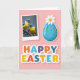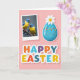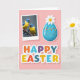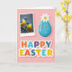 This card features a soft blush pink background with a layered spring layout that feels friendly and a little romantic in its gentle details 🌷. In the upper left, a faux photo-style frame shows two small birds nestled close on a textured branch, their deep blue heads and backs contrasting with bright yellow bellies as they lean toward each other with a calm, tender look. To the right, a glossy sky-blue egg floats nearby, dotted with orange, yellow, and purple circles that add a light, celebratory touch 🐇. A white flower with multiple petals and a warm golden center sits on top of the egg like a small crown. Along the bottom, large dimensional letters spell “HAPPY EASTER,” each letter in a different color such as tangerine, azure, amethyst, and sunshine yellow. The greeting text is centered across the lower third, with subtle shadowing that lifts the letters off the pink surface. Fine drop shadows also appear under the photo frame, egg, and flower, giving the whole scene a gentle 3D look.