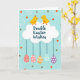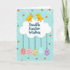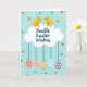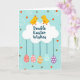 The front design shows two stylized yellow baby birds perched atop a fluffy white cloud shape, leaning toward each other with a tender, friendly gaze 🐰. One bird has a small red crest, and their rounded forms mirror each other to suggest closeness. Centered inside the cloud is a deep blue greeting, with the lettering arranged neatly across the middle. Below, decorated eggs hang down on thin dark-blue lines, like gentle ornaments floating in the air 🐇. The eggs include rosy pink ones with dotted patterns, a warm amber egg with white stripes, plus teal and deep violet eggs with white markings. The background is a soft sky-blue field sprinkled with small golden circles, bright orange triangle confetti, and curling white spiral accents. The cloud sits near the top-center, while the eggs descend in a tidy row beneath it with each string clearly visible.