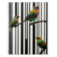 Three vibrant, multicolored birds perched on a branch, set against a striking black-and-white striped background, creating a bold contrast and an artistic visual effect.