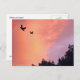 This beautiful fine art photography postcard captures two doves flying up into the sunset. The sky seems to be on fire with clouds in rainbow colors of red, orange, yellow, blue, magenta and purple. Just the very tops of the trees are showing in black silhouette.