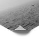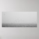 Birds flying over the ocean in thick fog. Black and white nature photography.