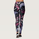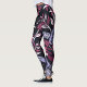A pair of legs wearing black leggings with a pattern of pink birds and tropical leaves, the person is wearing black and white sneakers, the background is plain white.