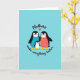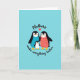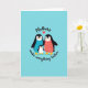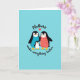 This card shows three stylized, flightless birds standing close together like a small family, with the two larger birds angled inward toward the smaller one in a protective, affectionate pose ❤️. Their bodies are deep black with bright white chests, and their beaks and feet are orange-yellow, giving the scene a sunny lift against a flat cyan background. One adult bird has a smooth turquoise belly, while the other has a coral belly dotted with tiny white and darker coral shapes that resemble a simple fabric pattern. All three have soft rosy cheeks, and the way their faces tilt toward one another suggests a gentle, friendly closeness. Near the top, the word “Mothers” appears in a flowing dark line, with a small red heart placed beside it. Near the bottom, the words “make everything better” are set in a curved line that mirrors the group’s rounded shapes, with a small 🌼 adding a light touch. The coral-bellied bird’s dotted pattern stands out clearly against the cyan field, while the red heart above provides a bright focal point.