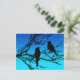 Postcard depicting two little birds, perched on a branch, as a black silhouette against a evening sky gradient of deep turquoise to cobalt blue, with a sprinkling of stars