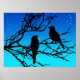 Print depicting two little birds, perched on a branch, as a black silhouette against a evening sky gradient of deep turquoise to cobalt blue, with a sprinkling of stars