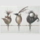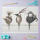Introducing the Stark Perch Trio, a group of three stylized birds perched on a wire, each with its own unique and exaggerated features: