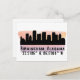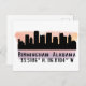 Postcard features skyline silhouette of Birmingham AL with map latitude and longitude coordinates on a watercolor splash background,