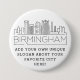 A customizable button representing the beautiful city of Birmingham, Alabama. This button features a stylized deco illustration of the city's unique skyline along with its name underneath. Underneath the city name is a spot for your unique slogan or statement about your favorite city.