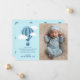 This adorable blue birth announcement card features a modern, vector-style hot air balloon floating amidst fluffy clouds. Paired with the words "Soaring High with Joy", it perfectly captures the happiness of welcoming your new arrival. Personalize the card with a vertical portrait photo of your baby and easily edit the text templates for a custom new baby announcement card.