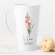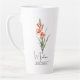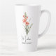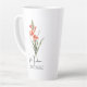 Birth month flower August Gladiolus latte mug featuring an illustration of a gladiolus flower. Below the flower, the name is written in an elegant script font. Beneath the name, it states "August - Gladiolus," indicating that owner's birth month is August and her birth flower is the gladiolus. It is a personalized mug, customized as a thoughtful gift for someone named Madison born in August.
